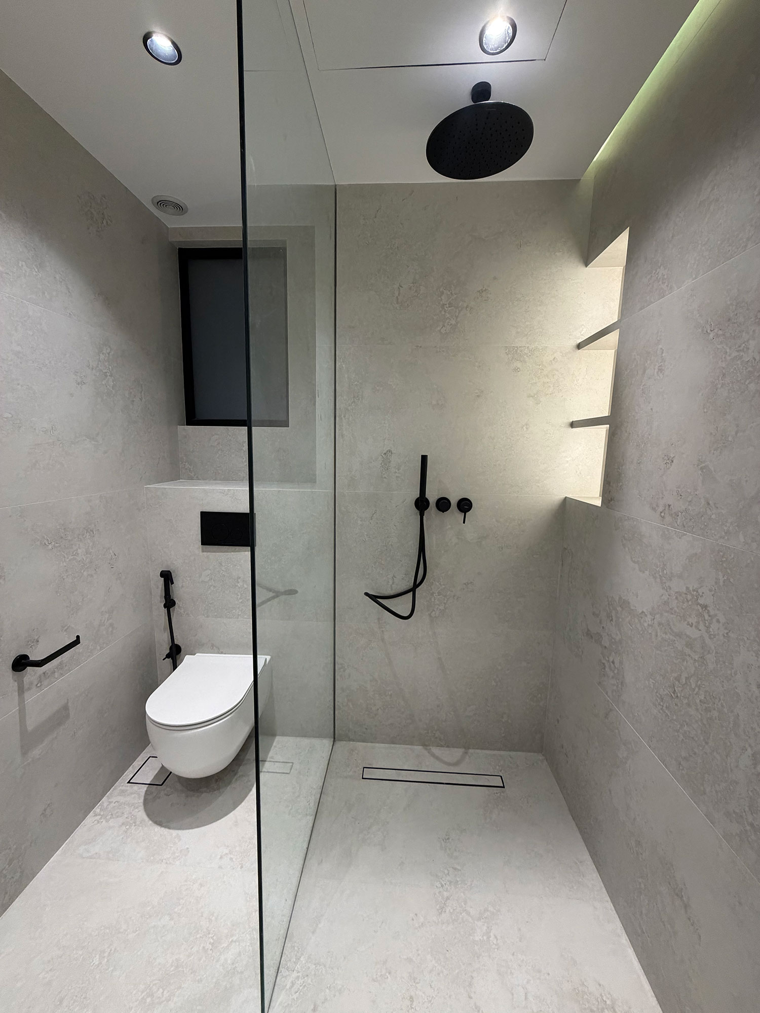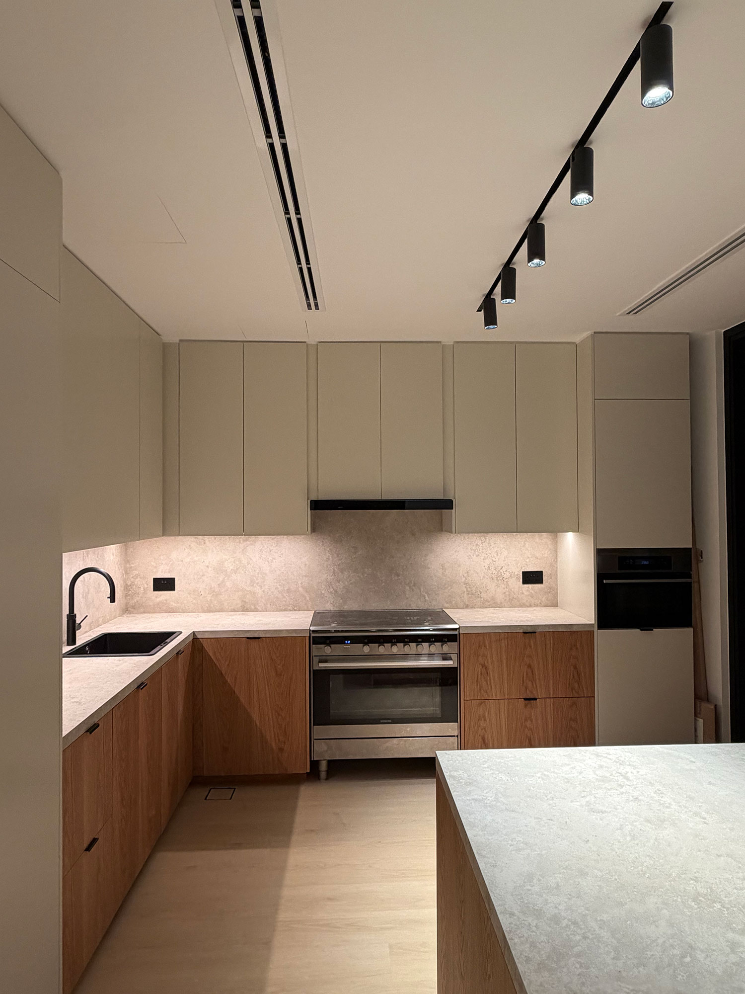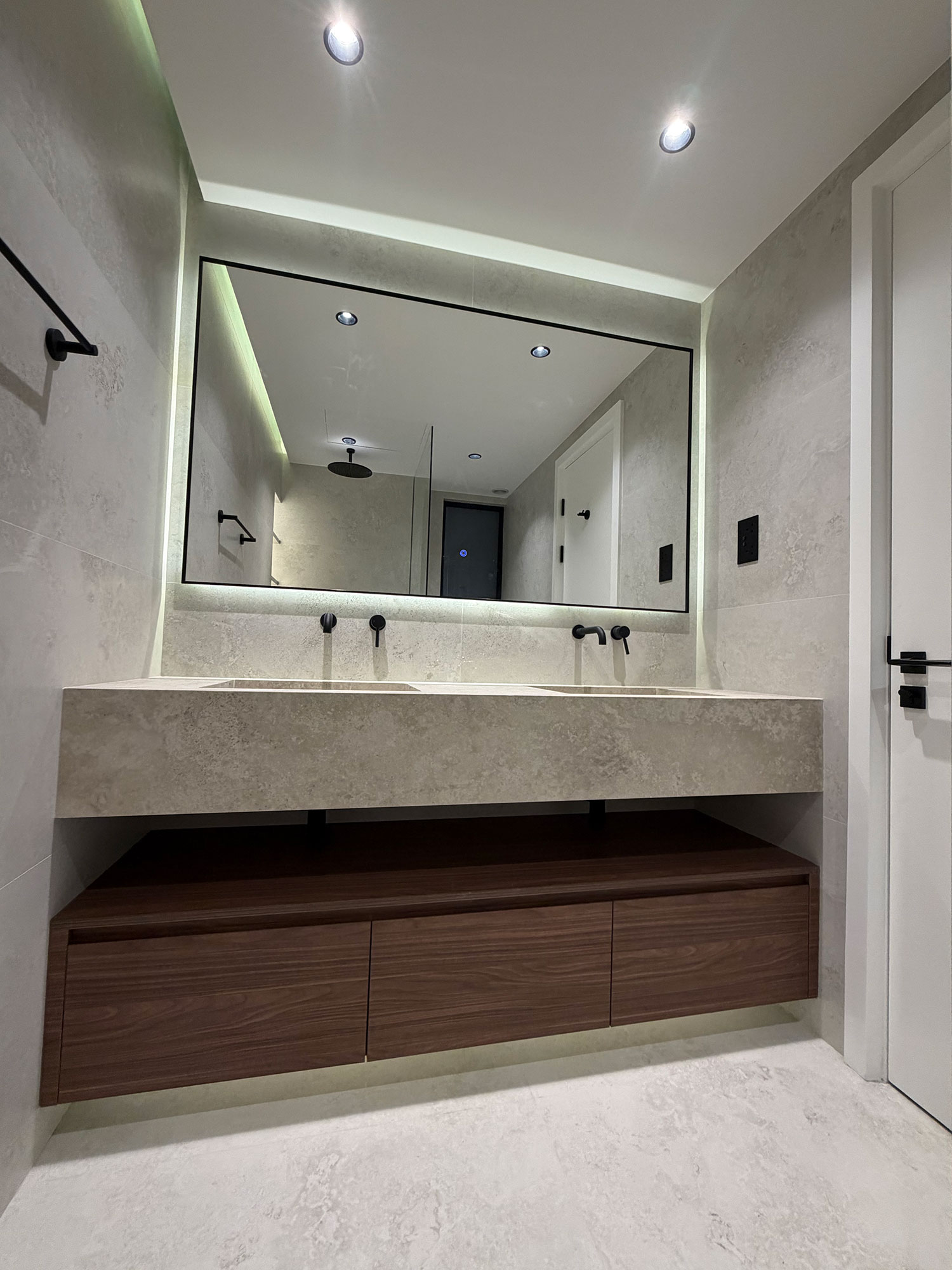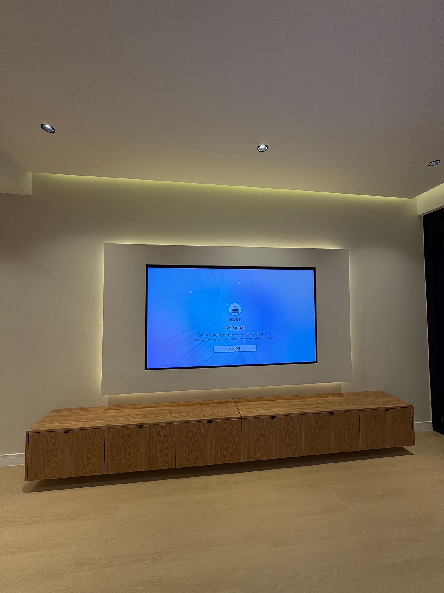 Complementing the ground-level transformation, our gypsum team executed an intricate ceiling master plan designed to integrate both form and function. This involved the construction of minimalist bulkheads and shadow-gap false ceilings that serve as the housing for hidden HVAC diffusers and smart lighting systems. The interplay between the solid, grounded texture of the new flooring and the light, sculpted geometry of the gypsum works created a sophisticated “envelope” of design. This project highlights our ability to manage the technical complexities of sub-floor preparation and ceiling suspension while maintaining a flawless, breathable aesthetic.